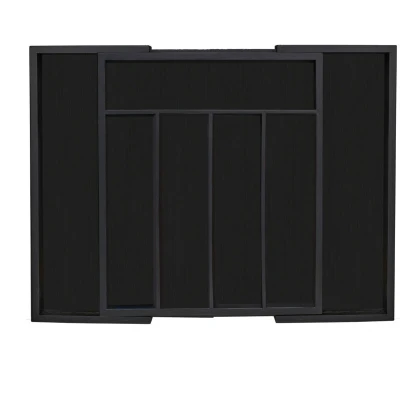 General description A cutlery tray is the optimal kitchen accessory for organizing and sorting knives, forks, spoons, and other kitchen utensils. This practical cutlery drawer provides ample space for a variety of cooking equipment. The sturdy cutlery tray is made from natural bamboo in an elegant black finish and features 5 main compartments along with 2 additional pull-out compartments, making it suitable for both small and larger kitchen drawers. Technical specifications Size extended (H x W x D): approx. 5.5 x 48.5 x 37 cm Min. size (H x W x D): approx. 5.5 x 31.5 x 37 cm Vertical compartments (H x W x D): approx. 3.5 x 6.5 x 26 cm Horizontal compartment (H x W x D): approx. 3.5 x 27.5 x 6.5 cm Pull-out compartments (H x W x D): approx. 4.5 x 8.5 x 35 cm Weight: approx. 1.6 kg Material: Bamboo, MDF Colour: Black Compatibility and accessories Fits many drawer types Also great for crafting and sewing supplies Other information Please ensure to measure your drawer accurately to
