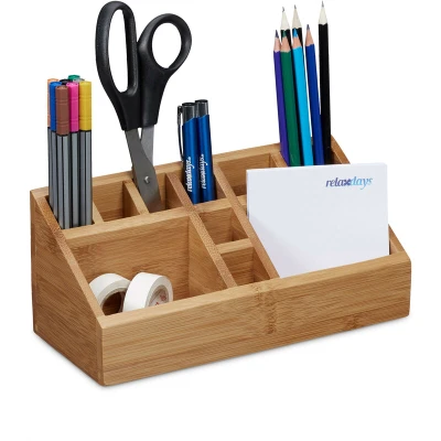 Relaxdays Bamboo Desk Organiser, Pencil Holder, 10 Compartments, Wood Grain, Size: x 23 cm, Natural Brown