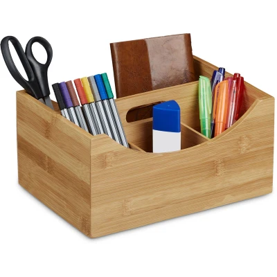 General description With the Relaxdays Bamboo Desk Organizer, you can finally put an end to the chaos covering your desk. This stylish and functional organizer features multiple compartments to tidy up your pens, pencils, scissors, rulers, and glue sticks, while also providing ample space for letters and A5 sheets of paper. Its timeless design and natural bamboo tone make it suitable for any room in your home, whether in the bathroom for cosmetics, in the kitchen, or on the table as a cutlery or utensil holder. Technical specifications Total size: approx 12 x 25 x 18 cm Small compartments: approx 7 x 7.5 x 7.5 cm Large compartment: approx 11 x 23.5 x 8 cm Material: Bamboo Weight: approx 0.6 kg Other information The desk organizer is made entirely out of high-quality bamboo, a sustainable and durable raw material. The unique wood grain pattern adds an eye-catching element to your office desk. It can be easily moved thanks to the handle. Included in delivery: Desk organizer (decorative