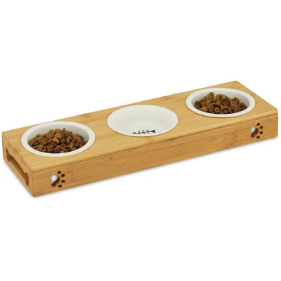 General description With this sturdy pet bowl bar, you no longer have to worry about knocked-over bowls and food sprawled across your floors. The bowls sit firmly in the robust frame, allowing your furry friend to munch right away. You can use the two bowls for various kinds of food and water, or choose to feed two pets at the same time. Both ceramic bowls can be easily retrieved and conveniently cleaned in the dishwasher. Technical specifications Bowl dimensions (H x D): approx. 4 x 12 cm Bowl capacity: approx. 180 ml each Total size of double bowl (H x W x D): approx. 5.5 x 29.5 x 14 cm Weight of double bowl: approx. 0.72 kg 3-piece bowl station dimensions (H x W x D): approx. 5.5 x 44.5 x 14 cm Weight of 3-piece bowl station: approx. 1.1 kg Compatibility and accessories Suitable for cats and small dogs, including puppies and small breeds such as Chihuahuas Included in delivery: 1 x Bamboo Bowl Holder Usage Fill the bowls with dog food and fresh water Clean the set regularly,