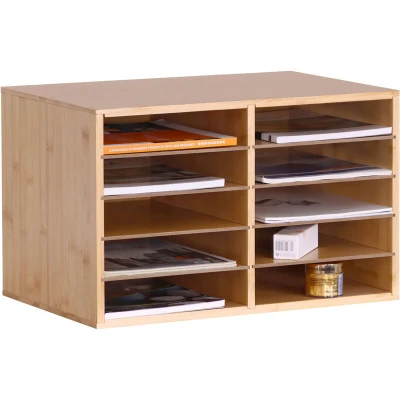 AmazonOrganisation: Document holder for the tidy storage of letters, notes, magazines and more. Basics: desk organiser in bamboo and MDF – approx. H31×W49×D31 cm – available in various colours Design: Office document organizer with 10 compartments for A4 paper – 8 inserts are removable Use: The roomy document organiser is perfect for desks in the office or home office. Practical: The organiser assembles quickly and stands steadily – rubber feet prevent scratches