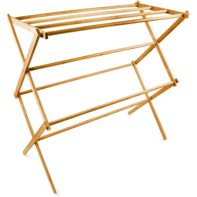 AmazonFreestanding towel holder with 8 towel rails on 4 levels with a length of 68 cm - For drying hand towels, bath towels and garments Towel stand for optimal air circulation - Your clothes dry faster and don't develop strange odours Large storage solution with a size of 73 x 74 x 36 cm - The stand can be easily folded together when not in use - Size folded: HxWxD: approx 8 x 74 x 36 cm The towel holder comes fully assembled - Simply open it up and start hanging up your towels and wet garments! The moisture-resistant bamboo makes this dryer stand an ideal addition to the bathroom and a practical clothes valet for the bedroom