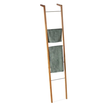 General description This beautiful Relaxdays Bamboo Ladder Rack is designed to store towels and clothes in a compact manner. It can be easily leaned against any wall, making it a versatile addition to your home decor. Whether in the bathroom, bedroom, or kitchen, this rack serves both functional and decorative purposes. Technical specifications Dimensions (H x W x D): 180 x 35 x 20 cm Weight: 1.9 kg Distance between rungs: 31 cm Material: Bamboo and steel Color: Natural Installation Quick assembly with included materials and instructions Freestanding design allows for flexible placement Usage Store towels, clothes, or use as a decorative piece Suitable for damp environments due to durable material Other information Included in delivery: 1 x Bamboo Ladder Rack in pieces, assembly materials, and instructions Decorative items shown in product photos are not included