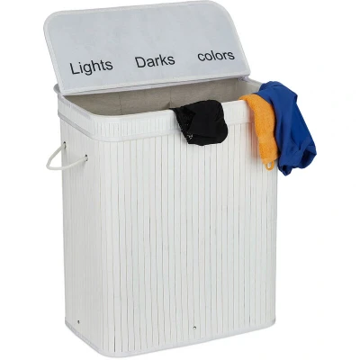 AmazonSeparate: White decorative laundry divider to sort dirty clothes - Ideal for bathroom and bedroom Compartments: Laundry bin with 3 compartments for light, dark and coloured laundry - 30l per bag Bamboo: Set exotic accents with the bamboo laundry basket - Moisture-resistant material Practical: Laundry basket with lid for better organisation - Side handles for easy carrying Details: Laundry sorter dimensions HWD: 63 x 55 x 35 cm - Each compartment HWD: 56 x 17 x 31 cm