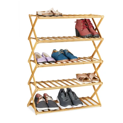 Relaxdays Bamboo Rack 5 Levels, 15 Pairs, Shoes Storage for Hallway, HWD: 89 x 67 26 cm Foldable, Stable, Natural