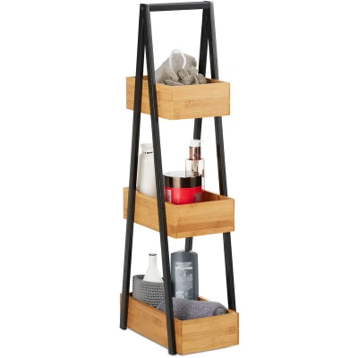 General description The Relaxdays Bamboo Bathroom Shelf is a compact 3-tier ladder rack designed for versatile use in bathrooms, kitchens, and other spaces. Its modern combination of natural bamboo and black metal not only enhances the aesthetic appeal but also ensures durability, making it suitable for humid environments. The shelf features three boxes that provide ample storage for small items such as cosmetics, stationery, and tools, fitting perfectly into small or unused niches. Technical specifications Dimensions (H x W x D): 81 x 18 x 30 cm Weight: 2.6 kg Capacity: 5 kg per tier Material: Bamboo, metal Colors: Natural, black Bottom inner size (H x W x D): 6.5 x 14 x 28 cm Middle inner size (H x W x D): 6.5 x 14 x 24 cm Top inner size (H x W x D): 6.5 x 14 x 20 cm Distance between tiers: 19.5 cm Installation Included in delivery: 1x Ladder Rack in pieces Assembly materials and instructions are provided Usage This versatile shelf can be used in various settings, including kitchens