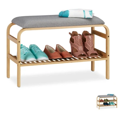 General description The Relaxdays Bamboo Shoe Bench is a stylish and functional addition to your hallway, bathroom, or bedroom. Made from natural bamboo, this shoe bench features a light, warm color that seamlessly blends with any interior decor. The grey seat cushion provides a comfortable place to sit while putting on shoes, making it a practical choice for any home. With ample storage space, it can accommodate slippers, sneakers, and ankle boots, keeping your footwear organized and easily accessible. Technical specifications Dimensions (H x W x D): 46 x 69 x 30 cm Load capacity of seat: 120 kg Load capacity of shoe compartment: 15 kg Weight: 3.5 kg Material: Bamboo, fabric Color: Natural, grey Compartment dimensions (1 level H x W x D): 23.5 x 66 x 30 cm Compartment dimensions (2 levels H x W x D): 14 x 66 x 30 cm Compatibility and accessories Holds approximately 3 pairs of shoes (1 compartment) Holds approximately 6 pairs of shoes (2 compartments) Installation Delivered in