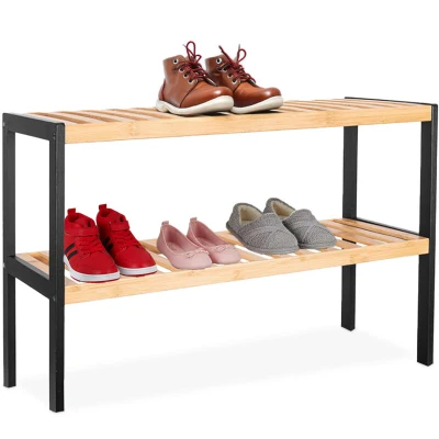 Relaxdays bamboo shoe rack, HxWxD: 33 x 70 26 cm, 2 tiers, holds 6 pairs, stand with open shelves, natural/black