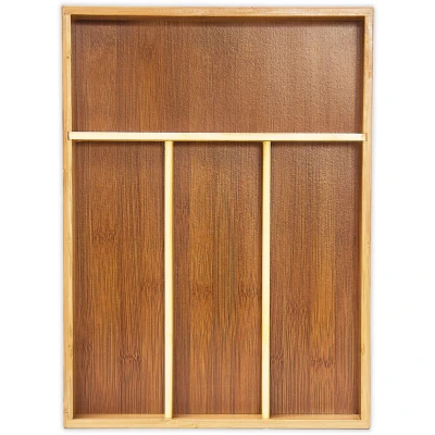 General description This bamboo drawer organiser is designed to help you keep your kitchen tidy and organized. With a total of 4 compartments, it is perfect for storing cutlery, knives, and other kitchen accessories. This practical must-have is made from sturdy bamboo, which is not only sustainable but also extremely robust, making it ideal for your kitchen and home. Additionally, it is moisture-resistant and will not dull your knives. Technical specifications Total size: 4 x 25 x 34 cm Size of large compartments: 7.5 x 22.5 cm Size of small compartments: 23.5 x 9 cm Weight: approx 0.5 kg Material: Bamboo Usage Ideal for cutlery, crafts, jewellery, and more Helps keep your belongings orderly Easy to clean Other information Included in delivery: Bamboo cutlery tray Decorative items shown in product pictures are not included