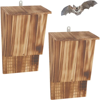 AmazonNature conservation: Bat boxes help native bats find shelter. Well-designed: narrow-entry bat house – protects bats from predators Material: Bat box made from fir wood - Scorched finish - Grooves underneath for gripping Installation: Hang the bat box in a sheltered, sunny spot at least 4 m high. Details: Bat box set of 2 - HxWxD: approx. 34 x 22.5 x 12.5 cm - Opening: approx. 18 x 2 cm