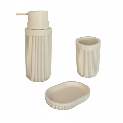 AmazonBathroom accessories: 3-piece set for a coordinated look in your bathroom Design: Beige bathroom set in polyresin - decorative stone effect with ribbed texture For soap: Refillable soap dispenser with pump for liquid soap - Dish for bar soaps Storage: Toothbrush cup for holding toothpaste and toothbrushes or rinsing your mouth. Details: Dispenser HxD: 17 x 6.5 cm - Dish WxD: 14 x 10 cm - Mug HxD: 10.5 x 7 cm
