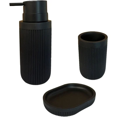 AmazonBathroom accessories: 3-piece set for a coordinated aesthetic in your bathroom Design: Black polyresin bathroom set – stylish stone effect with ribbed texture For soap: Refillable pump soap dispenser for liquid soap - Soap dish for solid soap Order: Toothbrush cup for storing toothpaste and toothbrushes or for rinsing your mouth Dispenser H×D approx.17×6.5 cm – Dish W×D approx.14×10 cm – Cup H×D approx.10.5×7 cm