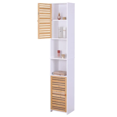 General description The Relaxdays bathroom cabinet is a compact and stylish solution for small bathrooms. With its tall and slim design, it offers ample storage space while saving valuable floor area. The cabinet features 6 compartments, perfect for organizing shower gels, lotions, perfumes, and other bathroom essentials. Its attractive white finish combined with natural bamboo doors adds a touch of elegance to your bathroom decor. Technical specifications Dimensions (H x W x D): 190 x 34 x 29 cm Compartment heights: 28 to 33 cm Load capacity per compartment: max. 8 kg Material: MDF, bamboo Colour: white, natural Installation Includes materials for secure wall mounting Assembly instructions are provided Usage Ideal for storing bathroom items and towels Adjustable shelf allows for flexible compartment height Cabinet doors feature a clever magnetic closure for secure storage Other information Includes 1x bathroom cabinet in flat pack Decorative items are not included