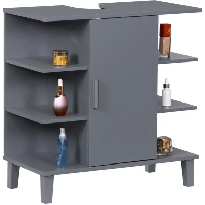 AmazonMore space: under-sink cabinet with central compartment provides extra storage beneath the washbasin With open shelves: bathroom cabinet featuring 6 open shelves for extra toiletries, towels and more. Compact washbasin cabinet with door storage – ideal for tight spaces, complements larger bathrooms Material: Durable washbasin cabinet in blue-grey MDF – adds a stylish touch to your bathroom Details: Bathroom cabinet dimensions HWD: 65 x 64 x 31 cm - Siphon cutout top WD: 15 x 17 cm