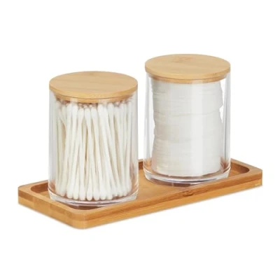 AmazonStorage: Bath container with 2 round cups - Practical storage for little accessories or cotton buds Closed: Cotton pad storage with convenient lid - Easy to refill - The contents remain dust-free Timeless design: Transparent cotton pads holder made of sturdy plastic - Bamboo sets natural accents Practical: Also suitable for storing hair ties, toiletries or other items - Container is washable Facts: Cosmetics container HxWxD: approx. 10x19x9 cm - Cup HxØ: 9.5 x 7 cm - Tray WxD: 19x9 cm