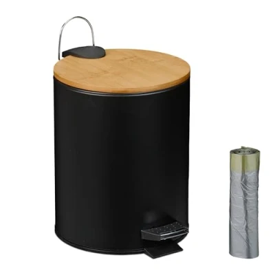 AmazonUniversal: Round bin with a 5-litre capacity for bathroom waste disposal - Includes 25 liners Design: Metal cosmetic waste bin in matt black – bamboo lid adds a natural touch Soft close: Sanitary bin with pedal and a soft-close lid for quiet and gentle closure Hygienic: Bathroom bin with removable plastic inner container and handle – for effortless emptying Practical: Bathroom bin with a foot pedal for hands-free opening and closing of the lid
