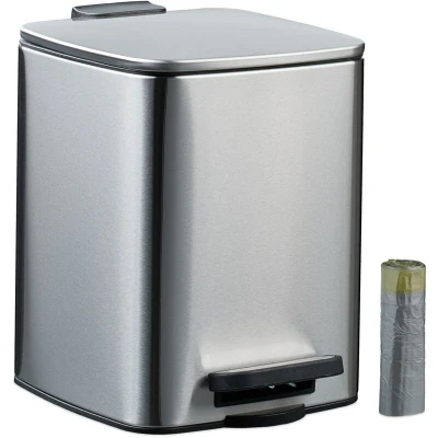 General description You can dispose of your sanitary waste hygienically and conveniently in this square pedal bin, suitable for both the bathroom and the dressing table. The practical foot pedal allows for hands-free opening, while the soft-close function ensures the lid closes gently and quietly. The removable plastic inner bin, featuring practical grip holes, makes emptying the rubbish bin effortless. Visually, this modern bathroom waste bin adds a contemporary touch with its sleek metal surface. Technical specifications Dimensions (H x W x D): approx. 25.5 x 20 x 23 cm Volume: approx. 6 litres Weight: approx. 1 kg Material: Iron, plastic, stainless steel (silver variant) Other information Includes bin liners Rear recessed handle for convenient carrying Available in various colours