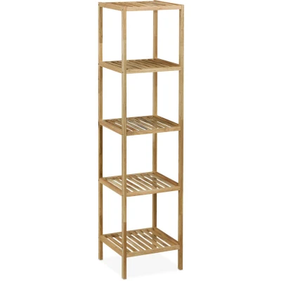 AmazonStorage: Bathroom storage rack with 5 open shelves for towels, toiletries, and more Design: Freestanding towel rack in natural walnut wood - decorative grain adds a charming accent All-rounder: Freestanding shelving unit for kitchen, hallway, and more - Utensils easily accessible Freestanding: The bathroom shelf can be placed anywhere without drilling - Versatile usage options Details: Wooden bathroom rack - Dimensions HWD: 146 x 35.5 x 35.5 cm - Fits in smaller bathrooms
