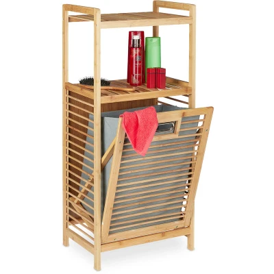 General description The Relaxdays Bathroom Shelf with Laundry Basket is a modern and stylish addition to any bathroom, designed to maximize storage space while maintaining a natural aesthetic. It features a combination of open compartments for cosmetics and other bathroom essentials, along with a foldable laundry bin for convenient storage of dirty laundry. Technical specifications Dimensions (H x W x D): approx. 95 x 40 x 30 cm Depth with folded-out door: approx. 58.5 cm Load capacity per shelf: approx. 3 kg Load capacity of laundry basket: approx. 5 kg Weight: approx. 4.5 kg Material: Bamboo, polyester Color: Natural, grey Shelf dimensions (W x D): approx. 37 x 30 cm Shelf spacing: approx. 24 cm Laundry bin dimensions (H x W x D): approx. 36.5 x 30 x 24.5 cm Installation Includes instructions and assembly material for easy setup. Usage Ideal for storing cosmetics, washing powder, and other bathroom items in the open compartments. Fold the door forward to easily access the laundry