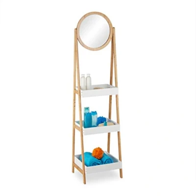 Relaxdays Bathroom Shelf with Mirror, Bamboo & MDF, H 159 x 39.5 40 cm, 3 Shelves, Standing Shelf, Bathroom, Hallway, Natural/White