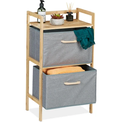 General description The Relaxdays Bathroom Unit combines functionality and style, featuring a compact design made of bamboo that enhances storage in both small and large bathrooms. It includes an open shelf and two fabric drawers, making it ideal for organizing cosmetics, towels, and laundry. Technical specifications Overall dimensions (H x W x D): 76 x 43 x 27 cm Internal dimensions per drawer: approx. 25 x 39.5 x 26 cm Load capacity per drawer: max. 5 kg Load capacity of shelf: max. 6 kg Weight: approx. 3.6 kg Material: Bamboo, polyester, cardboard Colour: Natural, grey Compatibility and accessories Includes 1 bamboo bathroom shelf (in individual parts) Includes 2 fabric baskets Assembly instructions and material included Decorative items are not included Usage The open shelf is perfect for storing cosmetics and bathroom articles, while the two fabric drawers are designed for sorting dirty laundry or storing towels. The foldable fabric baskets can be easily pulled out from both