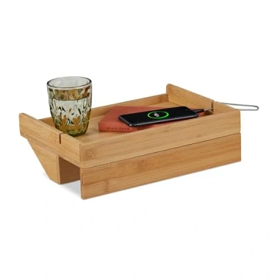 General description With this space-saving bedside shelf, you always have everything you need at hand. Whether alarm clocks, glasses, books, or even cups, everything has its place on the bedside shelf made of natural bamboo. The cable guide is particularly practical, allowing you to easily charge your mobile phone, tablet, and more. Thanks to screw clamps, the bed shelf can be mounted easily, quickly, and flexibly on the edge of the bed, making it ideal for small bedrooms or as a shelf for bunk beds. Technical specifications Overall dimensions (H x W x D): approx. 10 x 33 x 24 cm Storage surface (W x D): approx. 31 x 22 cm Compatible with bed edges from 2 to 6 cm Load capacity: up to 7 kg Weight: approx. 1.3 kg Material: Bamboo, iron Colour: Natural Compatibility and accessories Includes 1x hanging bed tray Includes 4x felt glides to protect bed edges from scratches Suitable for beds and bunk beds in bedrooms or children's rooms