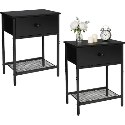This practical set of two bedside tables is the perfect addition to your home. With a modern metal and wood-effect design, they blend nicely into the bedroom, living room or hallway. A spacious drawer and an open shelf offer generous storage, while the top surface is ideal for a lamp, books or an alarm clock. Height-adjustable, non-slip feet ensure a stable stand on all floors. Bedside table set of 2 - Dimensions H x W x D: approx. 55 x 40 x 30 cm - Load capacity: max. 50 kg per table - Material: MDF, steel, non-woven fabric - Available in different colours Bedside table with drawer - Practical 2-piece set, can be used together or separately - Robust metal and MDF construction for lasting stability - Spacious drawer and open compartment for personal items - Stable on uneven floors thanks to adjustable, non-slip feet - Modern design suitable for bedroom, living room or hallway - Top surface ideal for lamp, alarm clock, décor or a good book - Versatile as bedside table, side table or
