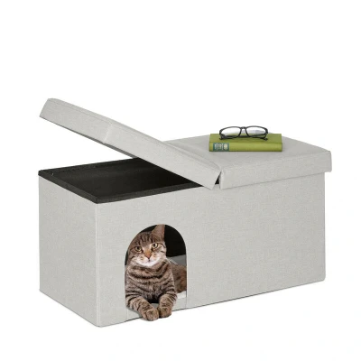 Relaxdays Bench Seat with Cat Cave, Folding, Indoor Pet Hideaway, Ottoman Lid, HWD: 38.5 x 74.5 37 cm, Beige, Fibreboard