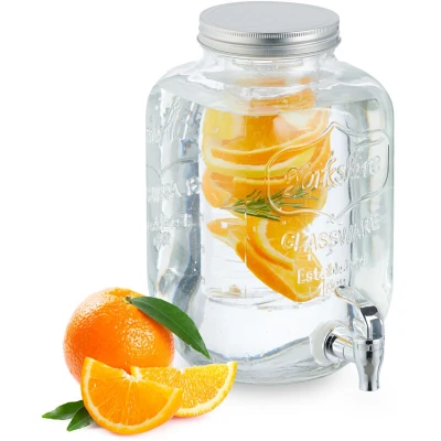 General description This lemonade dispenser in a decorative retro design is the perfect accessory for the home bar or the next garden party. The cocktail dispenser features a removable insert for fruit or ice cubes, allowing for easy dispensing of homemade juices, lemonades, and cocktails using the iconic tap. The screw-on lid protects the contents from insects and dirt, making it ideal for outdoor use. Technical specifications Capacity: 5 litres Dimensions: approx. 27 x 17 x 23 cm Weight: approx. 1.7 kg Material: Glass, iron, plastic Colour: Transparent, silver Usage Fill with drinks such as lemonade, juice, iced tea, and more. Ideal for garden parties, birthdays, or home bar use. Other information The glass is suitable for cleaning in the dishwasher. Clean the lid, tap, and insert by hand.