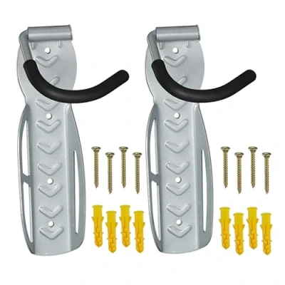 Wall mounted: Bicycle racks in practical set of 2 - For garage, living room, hallway or basement Space-saving: With the help of the bicycle holders, up to 2 bikes can be stored safely on the wall Secure hold: Each bicycle mount can bear a maximum load of 25 kg - Simply hook in the front wheel Material: Silver bike wall brackets made of steel - With foam padding to protect bike from scratches Details: Size per bicycle hanger HxWxD: approx. 26 x 11 x 14 cm - Including wall mounting material