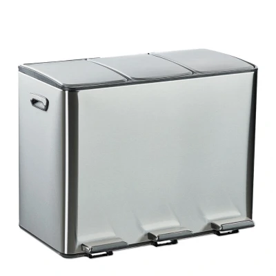 General description Waste separation has never been easier with the Relaxdays Kitchen Bin. This modern trio bin helps keep your home clean and hygienic, allowing for hands-free disposal of household and kitchen waste through foot pedals. The automatic closing mechanism ensures that the lid closes gently and silently, while the removable plastic inner bins with practical carrying handles make emptying the waste separation system easy. With its contemporary design, this kitchen bin looks great in any home. Technical specifications Dimensions (H x W x D): approx. 46.5 x 61 x 37 cm Volume: approx. 15 L each compartment Weight: approx. 8.2 kg Material: Stainless steel, plastic Usage 3 compartments for effective waste separation (plastic, paper, and general waste) Foot pedals for hands-free opening and closing Lid closes gently and quietly thanks to the soft-close feature Removable inner bins with handles for easy emptying 2 side handles for easy lifting