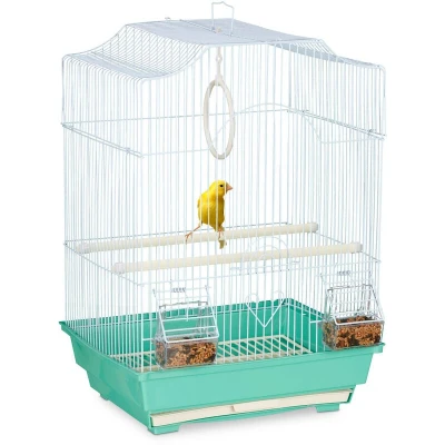 AmazonBird Home: Compact bird cage for canaries, finches and other small bird - come in green Accessories: Birdcage with 2 food dispensers, dirt trap, 2 perches and swing to play on Details: Bird cage with steel grid and plastic tray - H x W x D: approx. 49.5 x 35 x 32 cm Practical: Cage for birds with handle for transport - Removable bottom tray for easy cleaning Decorative: Exotic cage with curved roof and door with heart-shaped decorations - Antique style