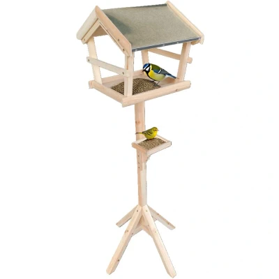AmazonHelpful: Bird feeder for attracting tits and more. - Includes second feeding point. Weatherproof: Natural-finish birdhouse made from fir wood - Weatherproof roof of galvanised iron Safe: bird feeder on a tall stand to shield against predators – stable with tripod design Educational: The bird feeder offers a great observation chance – a nature experience for all ages Details: Freely positionable bird feeding station - HxWxD: approx. 30 x 36 x 30 cm - Height: 121 cm