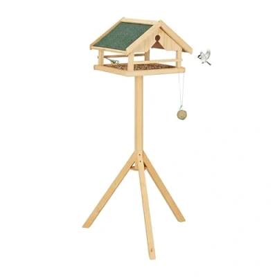 AmazonHelpful: Bird feeder for wild birds - ideal feeding station for blackbirds, blue tits and more. Weatherproof: Natural wooden birdhouse with asphalt roof - Keeps food and birds dry Safe: bird feeder on a high stand to protect from predators – tripod with holes for pegs Educational: Bird feeders offer a chance to observe nature - a great experience for kids and adults Details: Freely placeable bird station - House HxWxD: 30 x 37 x 37.5 cm - Height: 120 cm