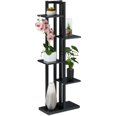 Relaxdays, Black Plant Shelf, Flower Stairs with 5 Shelves, HBT 117 x 43 22 cm, Steel and MDF, Indoor Fibreboard