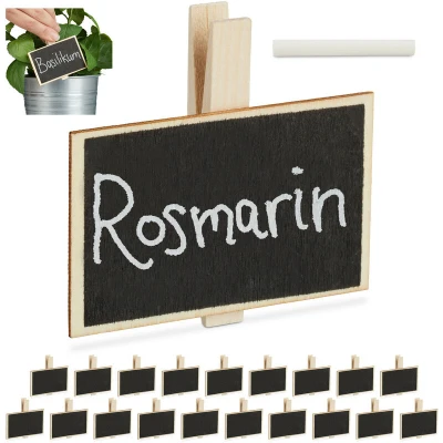 General description Decorate your herb pots on your balcony or in your home with these mini wooden signs, which serve as a decorative eye-catcher. The Relaxdays Board Clips set includes 20 reusable clips that can be utilized in various ways, such as wedding decor or creative price tags in flower shops. Technical specifications Dimensions total (H x W x D): approx. 7 x 7.5 x 1.5 cm Dimensions sign (H x W): approx. 5 x 7.5 cm Weight per sign: approx. 10 g Material: Wood Colour: Natural/Black Usage Ideal for labelling herb pots and plants at home Can be used as name plates at weddings and parties Write on the signs with the included chalk Reusable by simply wiping with a damp cloth Other information Included in Delivery: 20 herb signs and 1 piece of white chalk Decorative items are not included