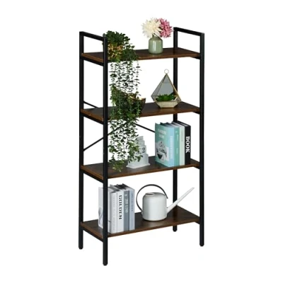 General description This industrial-style bookcase is perfect for storing and displaying books, decorative items, and plants. Its distinctive design, featuring black metal and a dark wood effect, makes it a rustic focal point in any living room, office, or bedroom. The stylish shelf provides ample storage space in a compact area and offers versatile usage options. Technical specifications Dimensions (4 compartments): 122 x 60 x 32 cm Weight: 10.5 kg Dimensions of shelves: 60 x 28 cm Load capacity per shelf: 10 kg Material: Iron, particle board Color: Black, brown Installation Includes mounting hardware for secure wall attachment Usage Ideal for displaying books, decor, and plants Can also be used as a storage shelf for kitchen and office Height-adjustable feet to level on uneven surfaces