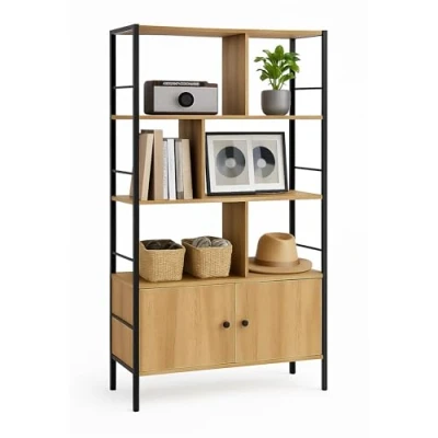 General description The Relaxdays bookcase combines functionality with a stylish industrial design, making it a perfect decorative focal point for any room. It features three open shelves ideal for displaying books, plants, and decorative items, along with a practical base cabinet for additional storage of boxes and files. Technical specifications Dimensions H x W x D: approx. 154.5 x 74 x 30 cm Dimensions of narrow compartments H x W x D: approx. 34 x 24 x 30 cm Dimensions of wide compartments H x W x D: approx. 34 x 44.5 x 30 cm Interior dimensions of cabinet compartment H x W x D: approx. 33 x 67.5 x 29 cm Load capacity per shelf: approx. 10 kg Total load capacity: approx. 50 kg Material: chipboard, steel, stainless steel Installation The bookcase can be securely mounted on the wall using the included assembly materials, ensuring stability and preventing tipping. Height-adjustable feet are also provided to compensate for uneven floors. Usage This versatile storage solution is ideal