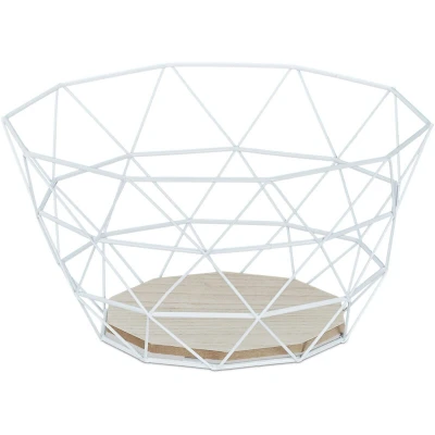 General description The Relaxdays Fruit Bowl is a decorative wire basket designed to enhance the presentation of fruits and vegetables. With its industrial design, this bowl not only serves a practical purpose but also adds a stylish touch to your kitchen or dining area. It is perfect for serving fresh fruits to guests or for displaying bread and rolls at breakfast. Technical specifications Total size H x W x D: approx. 14.5 x 28 x 28 cm Wire thickness: approx. 2-3 mm Weight: approx. 300 g Material: Iron, wood Usage Ideal for storing and displaying fruits and vegetables Can be used as a bread basket by placing a fabric napkin inside Suitable for various interior styles due to its elegant design Other information Available in various colours Included in delivery: 1 x metal fruit basket (decorative items not included)