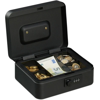 AmazonSafe: Black cash box with individually adjustable, 3-digit combination lock - Secure cash storage Clever: Thanks to the coin counting board, it's simple to keep an overview - insert for banknotes Versatile: Black coin box as team cash box in the club, for companies or private use Handy: Easy transport thanks to the handle - Also ideal to take along to events Details: Money storage made of sturdy steel - H x W x D: approx. 8.5 x 20 x 17 cm