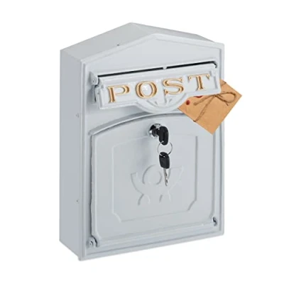 Relaxdays Box in Retro Look, Gold Coloured Lettering, Nostalgic Design, Wall Mounted Mailbox, 31.5x23x9 cm. White, Aluminium