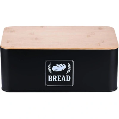 Amazon MarketplacePractical: Black bread box with a snug bamboo lid – keeps your baked goods fresh longer Robust: Bread storage box with sturdy metal casing - Ideal for daily kitchen use Stylish: bread box in a retro design with 'Bread' print – size (HxWxD) approx. 13.5 x 33 x 19 cm Easy to clean: bread bins with smooth surfaces – quick to wipe with a damp cloth Flexible: bread box for storing bread, rolls, toast, croissants, cakes or biscuits