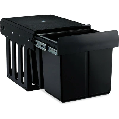 General description The Relaxdays Built-in Waste Bin is a practical and space-saving solution for your kitchen. Designed to fit seamlessly into your cabinetry, it can be installed under the sink or in any suitable cabinet. The unit features easy-running telescopic rails that allow for complete pull-out access, making waste disposal convenient and efficient. With two removable bins, each equipped with a handle, sorting and removing waste is hassle-free. Made from durable plastic, this double waste bin is also easy to clean. Technical specifications Total size (H x W x D): approx. 35 x 33.5 x 47.5 cm Fully extended depth: approx. 95 cm Volume of each waste bin: approx. 15 L Minimum cabinet width (inside): 40 cm Total weight: approx. 4.4 kg Material: Plastic (ABS, PP), metal Colour: Black Installation Quick installation in the base unit using the included mounting material. Usage Designed for convenient waste sorting and disposal. Bins can be easily removed for cleaning and emptying.