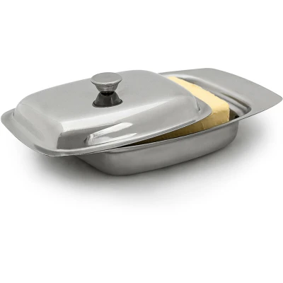 General description This practical butter dish is made of polished stainless steel, designed to store butter while enhancing your breakfast table's aesthetic. The shiny metal surface adds a modern touch, making it suitable for various occasions. Technical specifications Dimensions: 6 x 19.5 x 13 cm (2.4 x 7.7 x 5.1 in) Weight: approx. 0.16 kg (0.4 lbs) Material: stainless steel Capacity: for a 250 gram stick of butter Usage Keeps butter soft, whether stored inside or outside of the fridge Ideal for serving breakfast or brunch Also suitable for keeping cheese and other food fresh