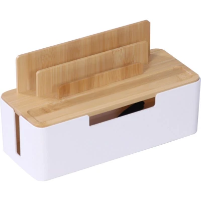 AmazonOrganisation: Cable box for hiding 6-way power strips and charging cables – no more cable clutter Design: Modern power-strip box in natural white with bamboo lid Multiple: Cable box with side openings and vents for heat dissipation Mount: Cable box with 3 holders for phones & tablets - H x W x D: approx. 16x30x13 cm Practical: child-safe cable box – includes 6 cable ties for tidy cables