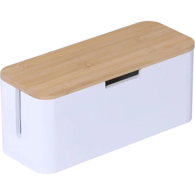 The practical bamboo cable box keeps cables tidy, whether by the TV or on your desk. It fits a 6-socket power strip and neatly hides cables from your TV, laptop, console or chargers. Several side openings allow organised cable routing. The magnetic lid keeps the organiser closed and protects your devices from dust and curious hands. Cable box in detail - Dimensions H x W x D: approx. 14.5 x 34 x 11 cm - Material: bamboo - Available in different colours Socket box for cable management - Practical cable storage with room for a 6-way power strip - Ideal for the living-room TV area or the desk - Multiple cable outlets allow simultaneous charging of several devices - Non-slip design and cable channels help protect sockets from dust - Provides added safety for children and pets - Lid with magnetic closure for secure fit - Made of sturdy bamboo for a natural look - Ventilation slots on the base prevent heat build-up - Includes 6 cable ties for neat bundling of cables Included in delivery