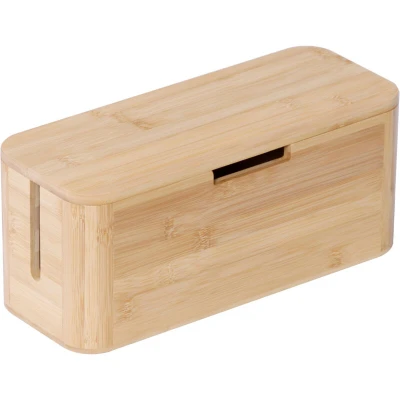 The practical bamboo cable box helps you organise cables, whether by the TV in the living room or on your desk. It holds a 6-way power strip and neatly hides cables for your TV, laptop, console and chargers. Several side openings allow clear cable management. The magnetic lid of the cable organiser keeps everything secure and protects your devices from dust and curious hands. Cable box in detail - Dimensions H x W x D: approx. 14.5 x 34 x 11 cm - Material: bamboo - Available in different colours Socket box for cable management - Practical cable storage with room for a 6-way power strip - Ideal for the TV area or the desk - Multiple cable outlets let you charge several devices simultaneously - Non-slip base protects the unit and prevents dust entering sockets - Cable organiser increases safety for children and pets - Lid with magnetic closure for secure fastening - Sturdy bamboo for a natural look - Ventilation slots in the base prevent heat build-up - Includes cable ties and