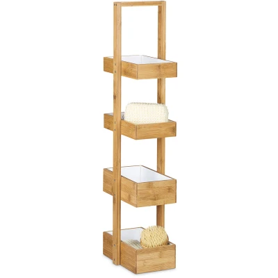 General description The Relaxdays Bamboo Bathroom Shelf is a versatile storage solution featuring 4 baskets, perfect for organizing small items such as cosmetics, desk utensils, or tools. Its compact design allows it to fit seamlessly into small corners and niches, making it an ideal addition to any bathroom or other humid environments. Technical specifications Dimensions (H x W x D): 88 x 25 x 18 cm Weight: approx. 2.1 kg Basket dimensions (H x W x D): approx. 5 x 25 x 15 cm Distance between baskets: approx. 15 cm Material: bamboo Other information Assembly instructions included Decorative items are not included in the scope of delivery