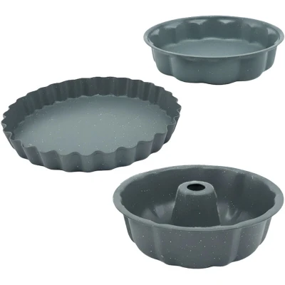 With this 3-piece baking tin set you're ready for baking adventures. The set includes a Gugelhupf tin, a tart base tin for tarts and sponge bases, and a classic round tin for butter cakes, cheesecakes and more. Carbon steel ensures even heat distribution and reliable results. Non-stick coating releases cakes easily. Baking tin in detail - Gugelhupf tin H x D: approx. 25.5 x 7 cm - Round tin H x D: approx. 27.5 x 5 cm - Tart base tin H x D: approx. 28 x 4 cm - Heat-resistant to 220 °C - Material: Carbon steel - Colour: grey 3-piece round cake tin set - 3-piece set for baking various cakes - For cake bases, tarts, sponges, ring cakes and more - Non-stick coating for easy release - Carbon steel for even heat distribution - Easy to clean by hand Included - 1x cake tin - 1x tart/fruit tin - 1x Gugelhupf tin - Decorative items not included