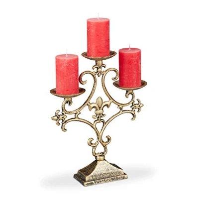 Relaxdays Candle Holder, 3 Armed, for Tealight and Pillar Candles, Vintage, Cast Iron, HxWxD: 28.5 x 23 7.5 cm, Gold